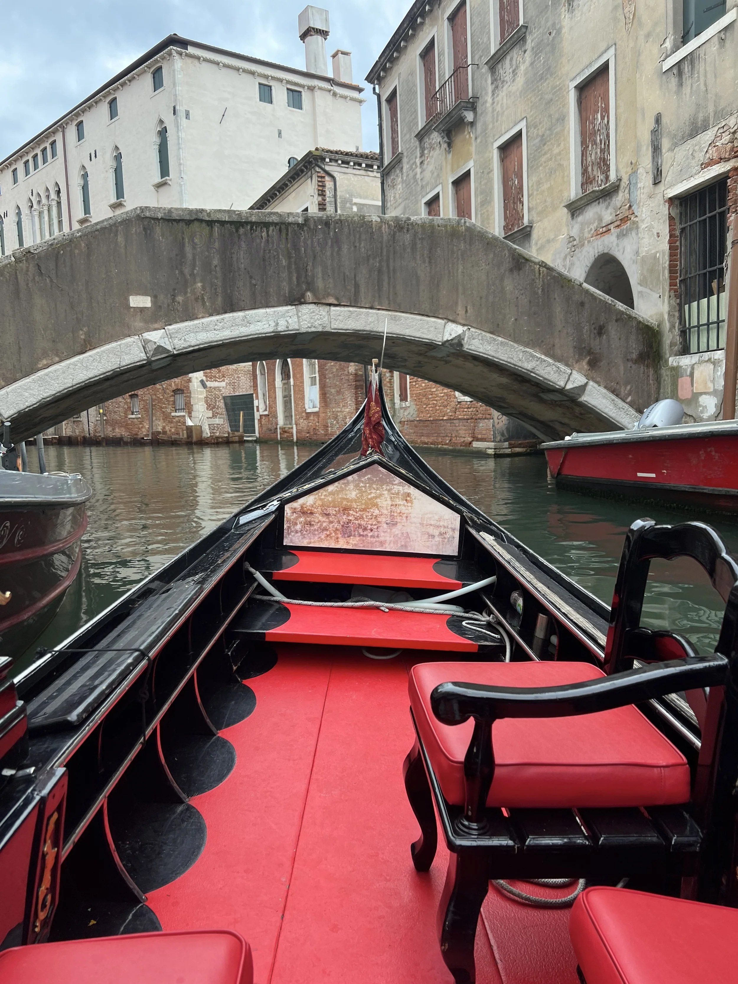To be a gondolier is a regulated professional activity, and therefore the price is determined by the city. At the time, the cost of a half-hour ride in the daytime was 90€, which increases to 110€ after sunset. Our ride was at a perfect time just before dusk, with a cool breeze. We first headed out into the Grand Canal, where our gondolier pointed out several sites including the impressive Chiesa dei Santi Geremia e Lucia, which houses the remains of Santa Lucia, a saint from the Sicilian city of Siracusa.