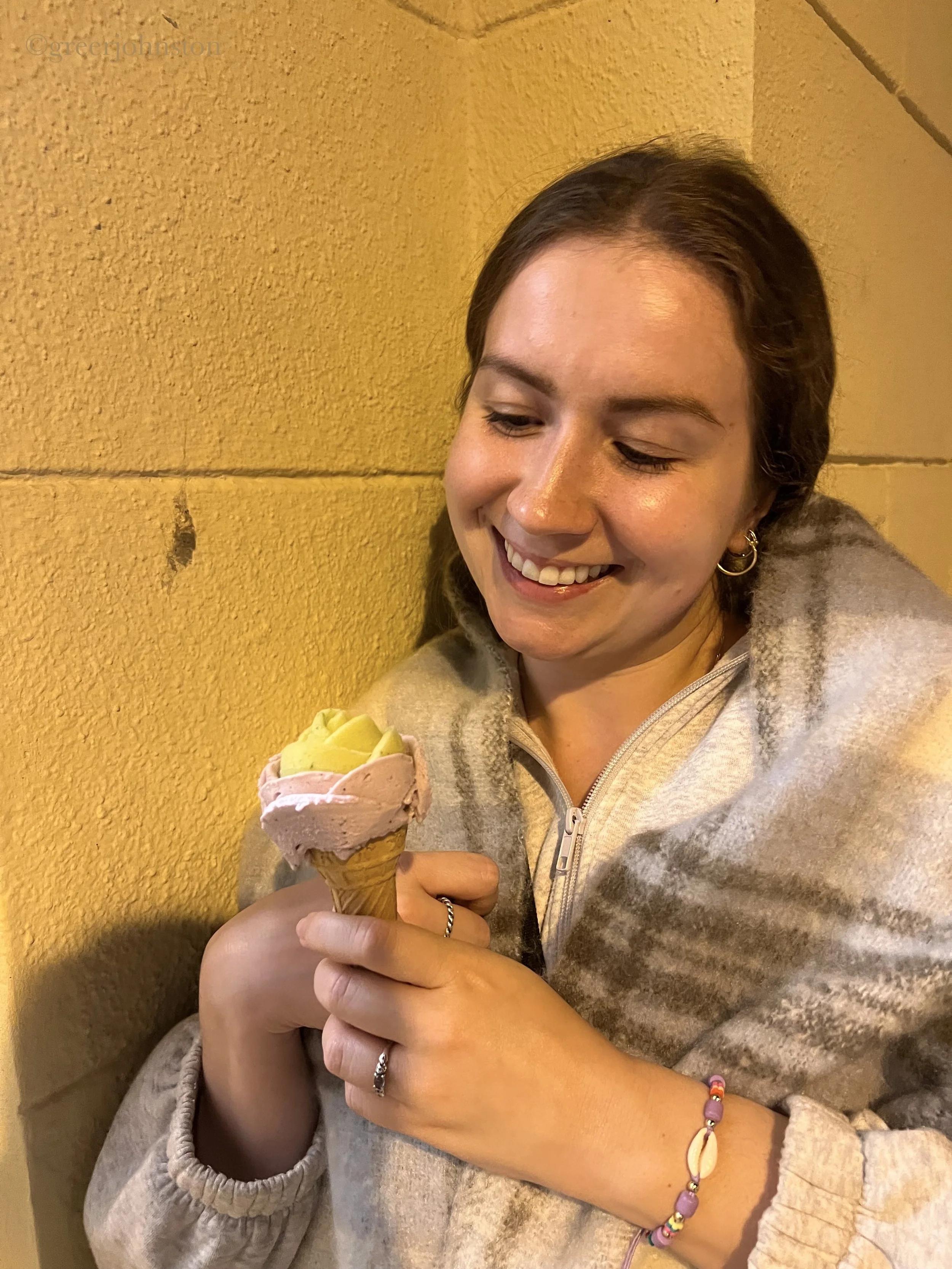 On the last night of our trip, there was still one last place I needed to try. I had seen the beautiful, petal-scooped artisanal ice cream from Gelarto Rosa on Instagram, and I already knew what flavor I would take. I took a small cone with two flavors, a tart basil-lemon sorbet in the middle, with delicate white chocolate and lavender ice cream petals on the outside. The combination of sweet and tart was delicious, and definitely one of the prettiest ice cream cones I’ve ever had. Paired with a stroll in the shadow of the incrdible Szent István Basilika (St. Stephen’s Basilica) lit up at night, it was the perfect last night in Budapest.