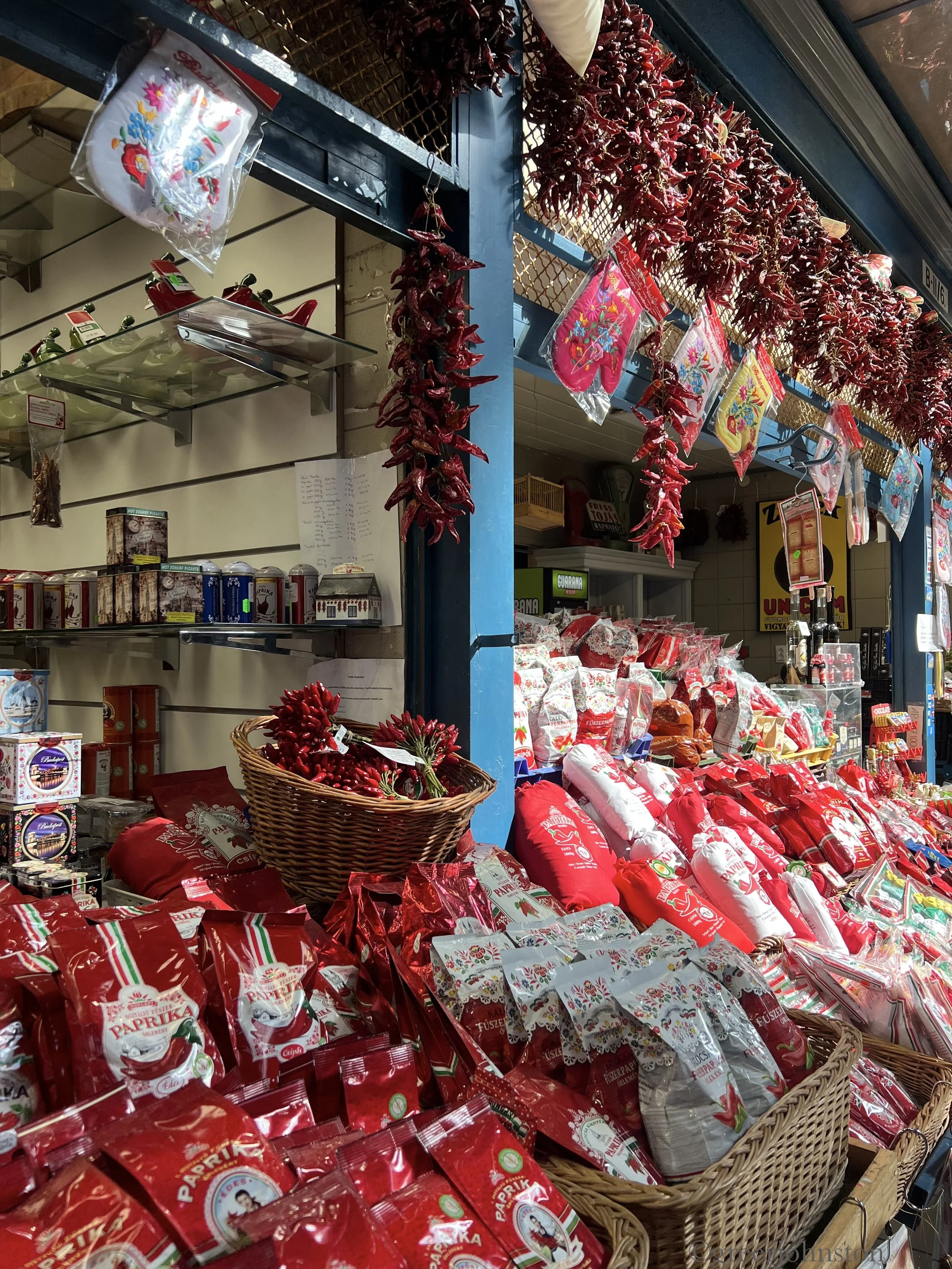 We visited the Central Market Hall, where we picked up some paprika, which I think is the essential souvenir from Hungary. There are two varieties: hot and sweet. The first floor of the market is a traditional food market also with fruits and vegetables, and upstairs there are vendors selling souvenirs.