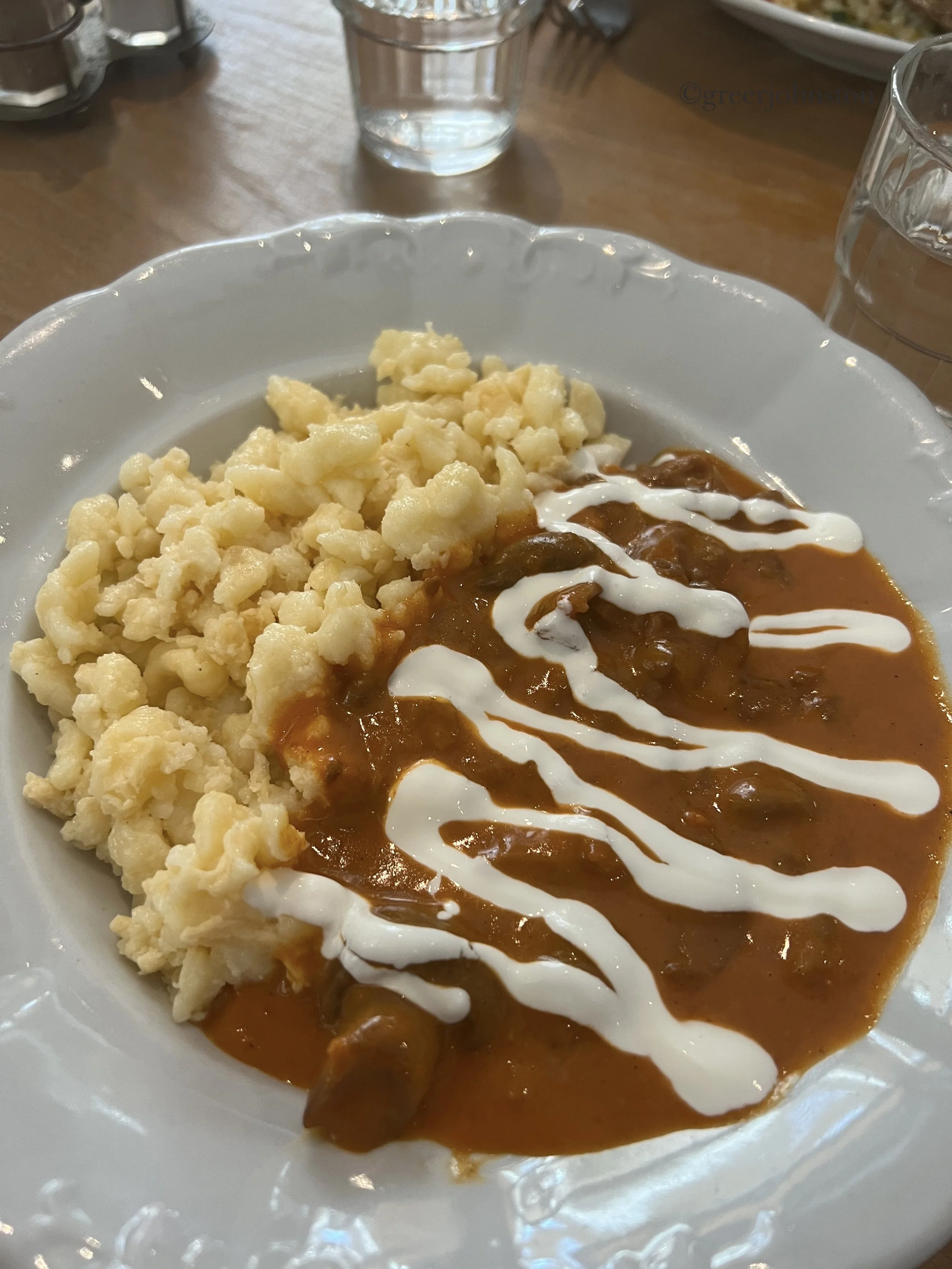 I am even more glad because on the way, we walked past Gettó Gulyás, which looked so rustic and charming. I particularly wanted to try it because looking at the menu outside, I saw they offered a vegetarian mushroom version of the typical paprikash dish which I desperately wanted to try. The paprikash sauce (and usually chicken) are served alongside galuska, an egg dumpling that reminds me of spätzle, though I would say it is more eggy than doughy. They were already almost completely booked for reservations for the weekend, but we were lucky to find a place during lunch where we enjoyed some traditional Hungarian food.