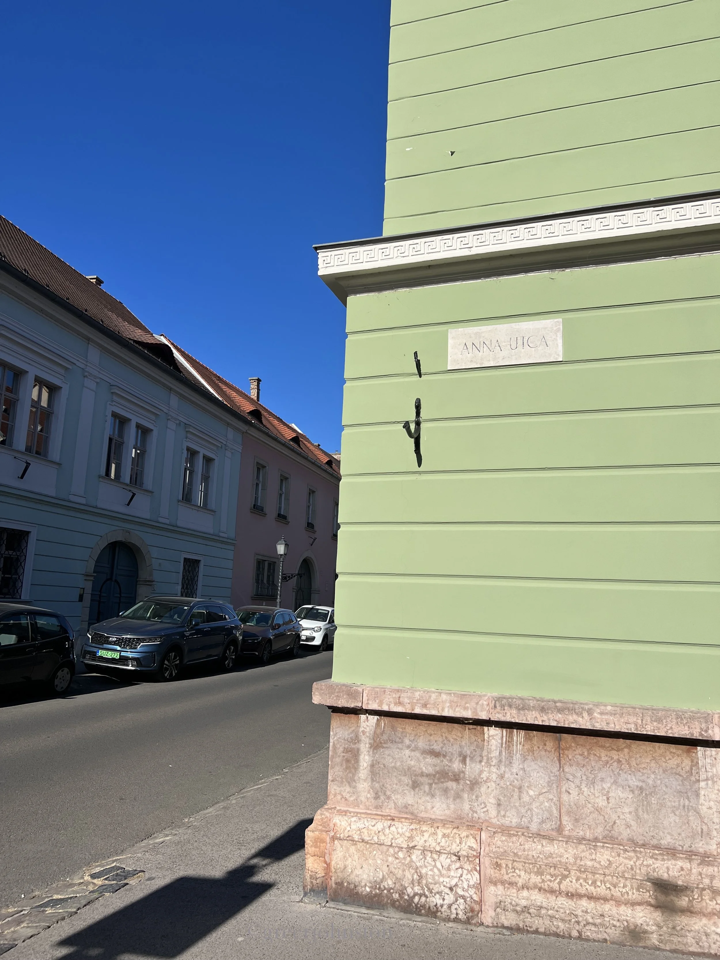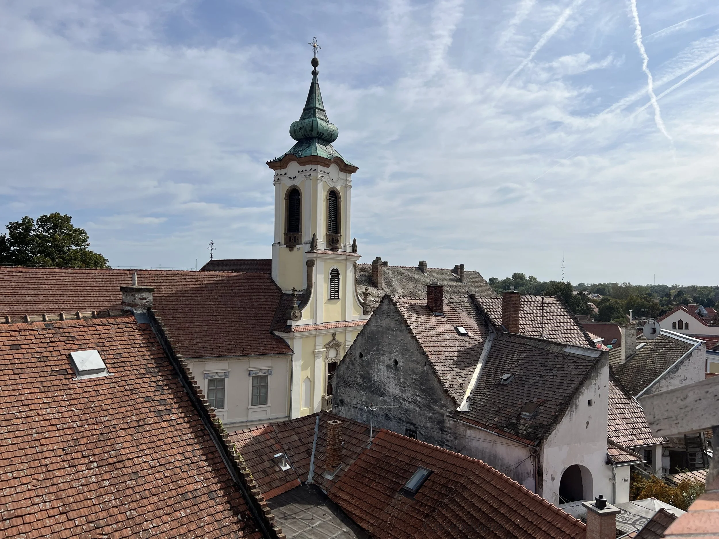 The town was very cute, and understandably crowded with tourists on a Saturday. However, I enjoyed the change of pace, and seeing another side of Hungary outside of the capital city. While here, we finally tried lángos, a local dish of hot fried dough, which always sounds like a good idea, topped with sour cream and grated cheese. We followed a narrow alley to find Álomlángos, a well-known hole-in-the-wall. Quite literally a small garden nestled in the wall, there are a few tables and benches, or places to stand and enjoy your treat. We then continued to follow the alley up to a small square, that of Saint John the Baptist parish, where we were able to take in a view of rooftops.