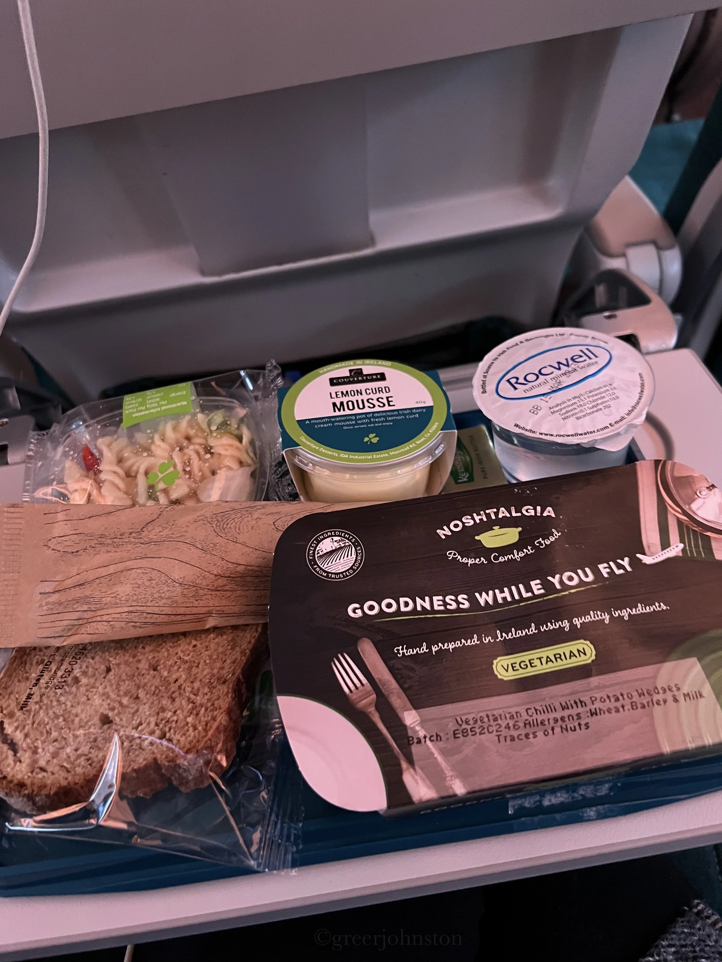 Speaking of the meal service, I was very content with the meals on Aer Lingus as well. I always order a vegetarian meal, and I found the dinner to be very tasty and satisfying, including a vegetarian chili, pasta salad, and bonus points for the lemon (!) mousse dessert. They are also using wood utensils instead of single-use plastics, which prompted me to look into their sustainability plan which includes efforts towards more efficient planes and the development of a Sustainable Aviation Fuel.